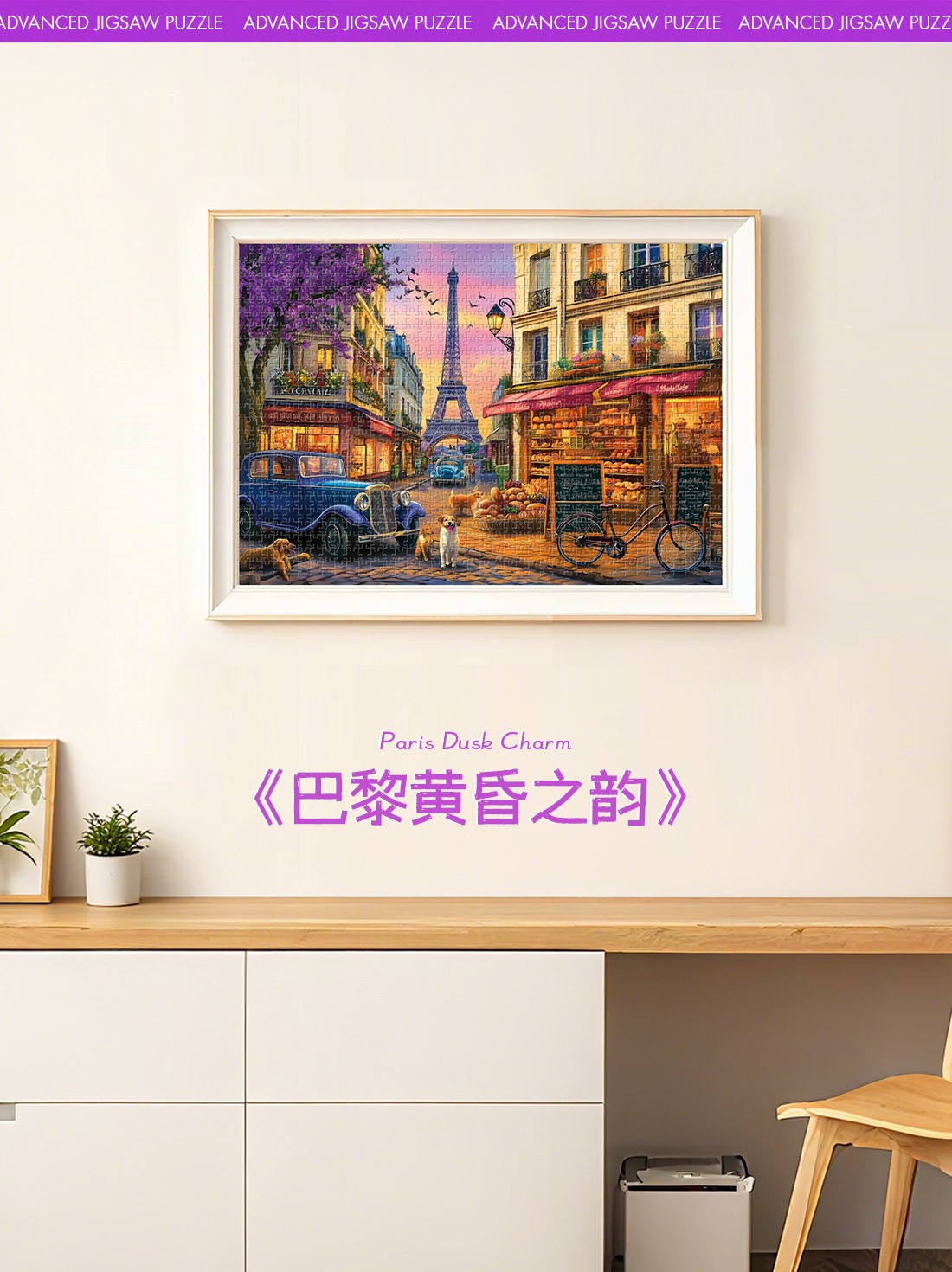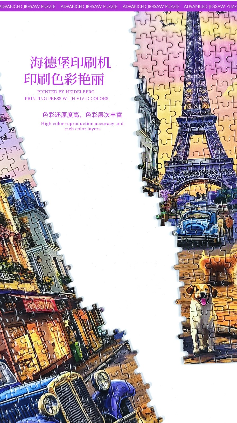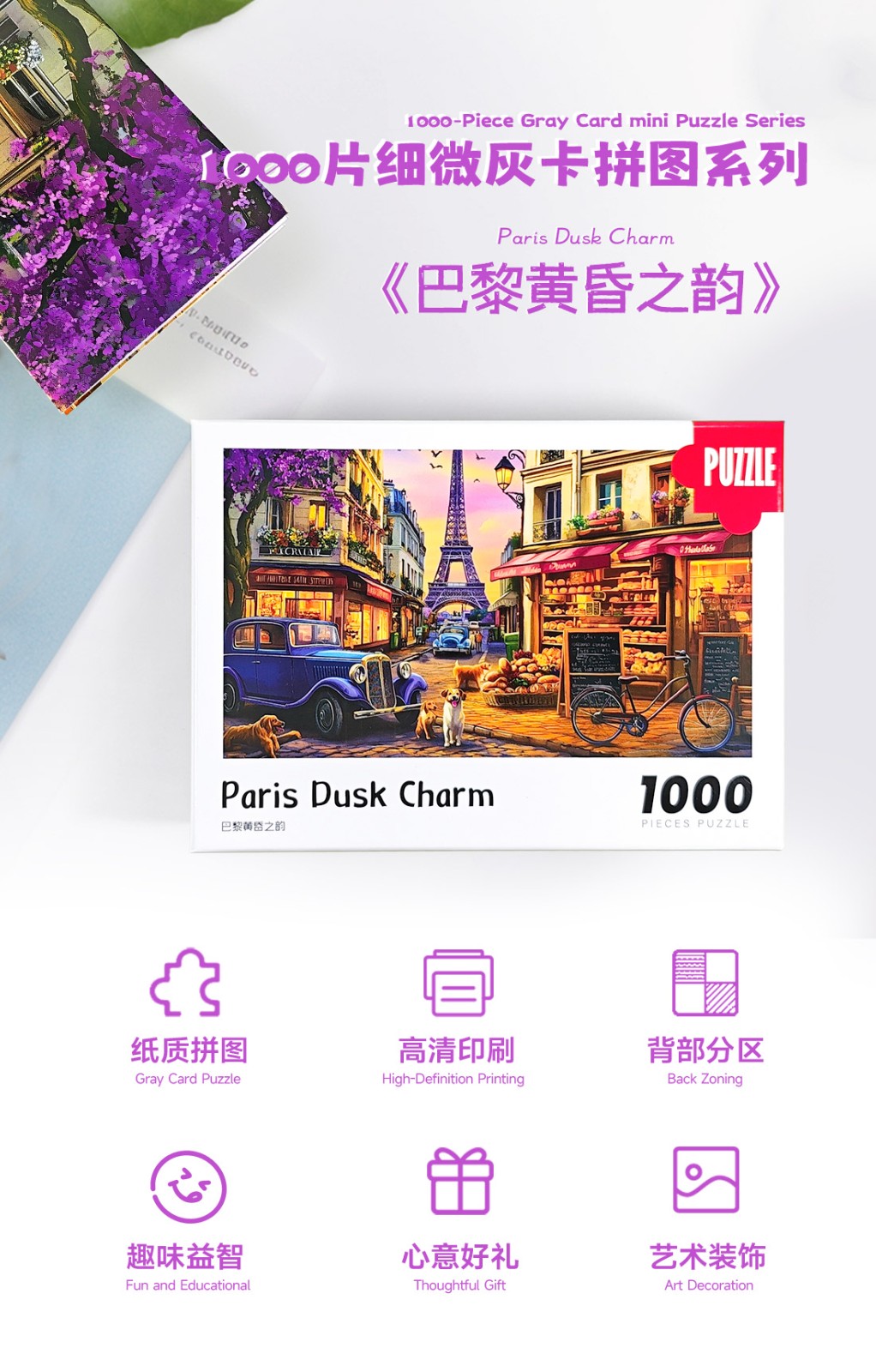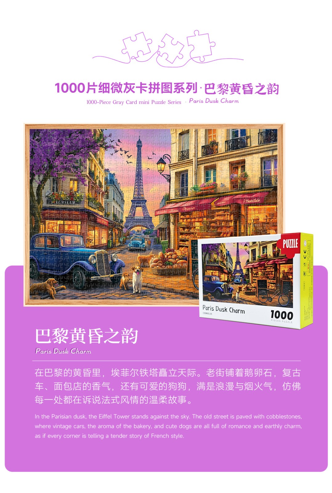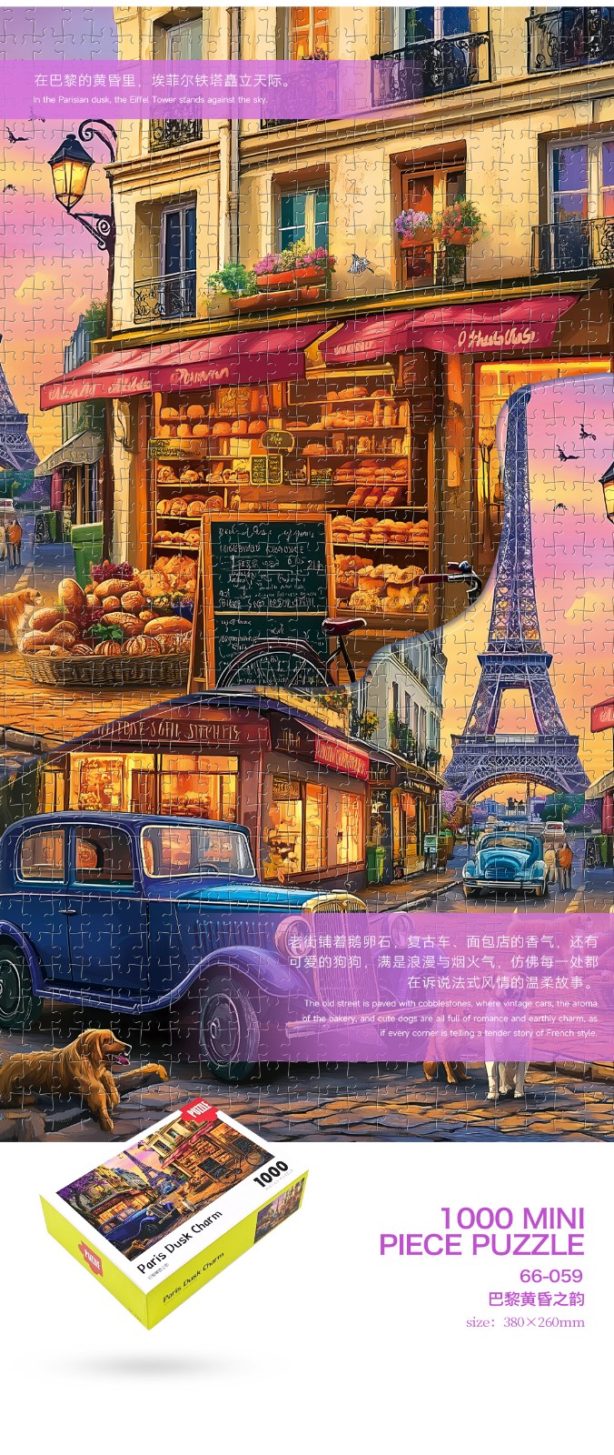 拼圖名稱:巴黎黃昏之韻 拼圖尺寸:380*260MM 拼圖片數:細微灰卡1000片 加工方式:廠規、來圖定制 包裝尺寸:180*130*50mm